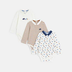Короткий комбинезон в полоску и боди с воротником поло коричневого цвета для новорожденного