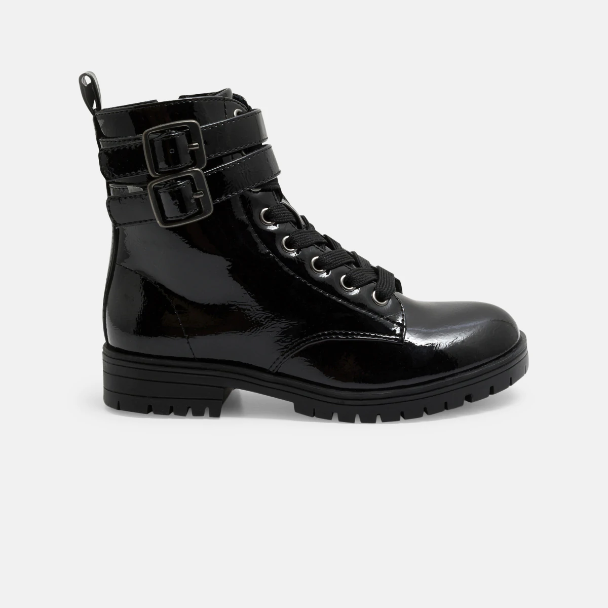 Вам понравится байкерский стиль этих лакированных сапожек с пряжками, сочетающихся как с юбкой, так и с брюками. Легко и быстро надеваются благодаря застежке на молнию и шнуркам.