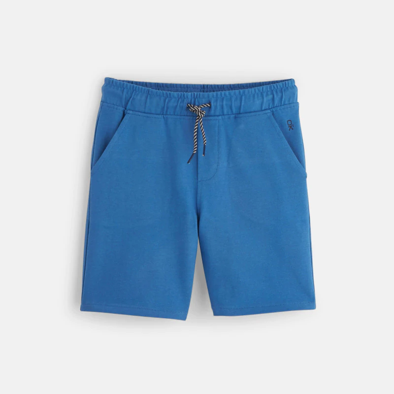 Шорты-бермуды для мальчика. Хлопковый трикотаж. Пояс на резинке со скользящим шнурком для завязывания. 2 косых кармана спереди. 2 ложных кармана сзади. Прошивка в тон. Небольшой логотип Okaïdi.