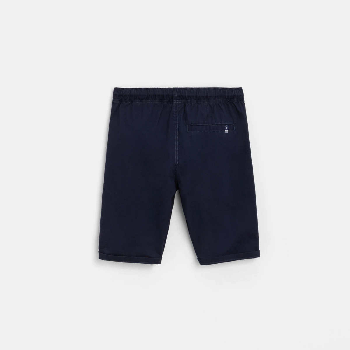 С наступлением первых теплых деньков эти темно-синие бермуды кроя slim будут сопровождать вашего мальчика во всех приключениях! Мальчику понравится удобный пояс на резинке со скользящим шнурком для завязывания спереди. Обратите внимание на приятные детали: мятые складки, два функциональных косых кармана и 1 карман-обманку сзади.