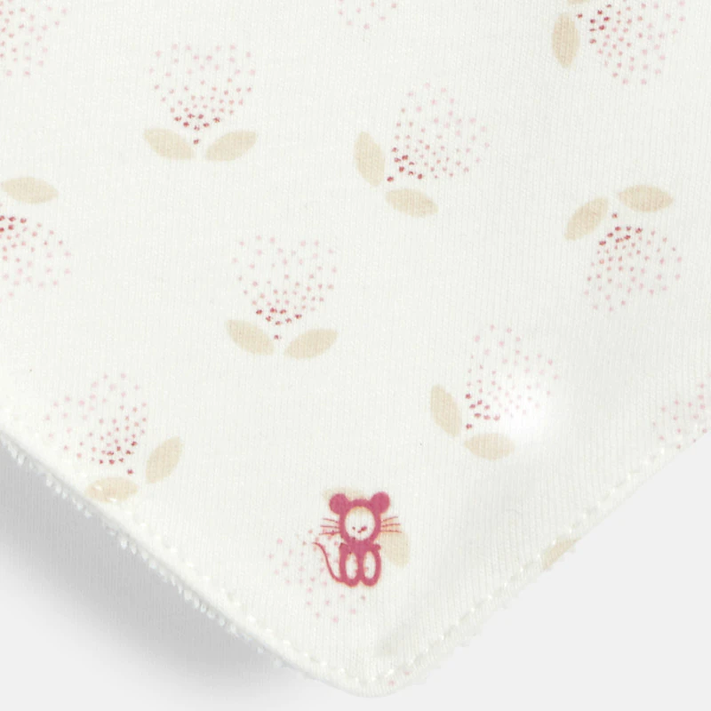 Этот набор слюнявчиков, сочетающихся с коллекцией Obaïbi, обязательно пригодится для защиты одежды вашей малышки во время еды. Одна однотонная модель с мордочкой мышки и одна модель с цветочным узором. Из джерси и махровой ткани.