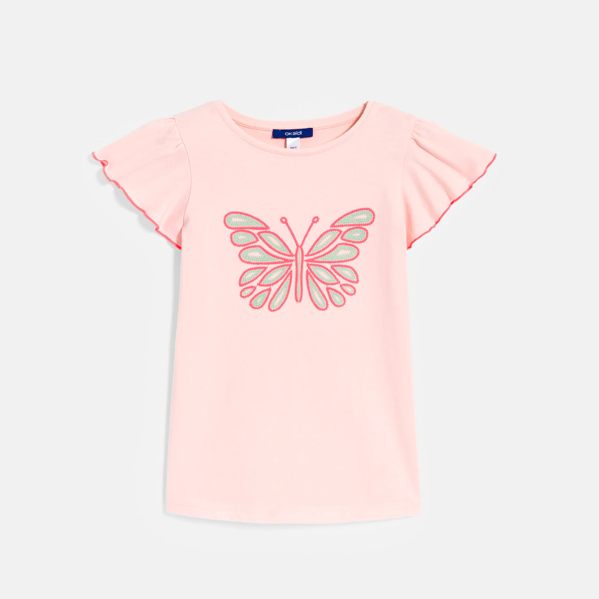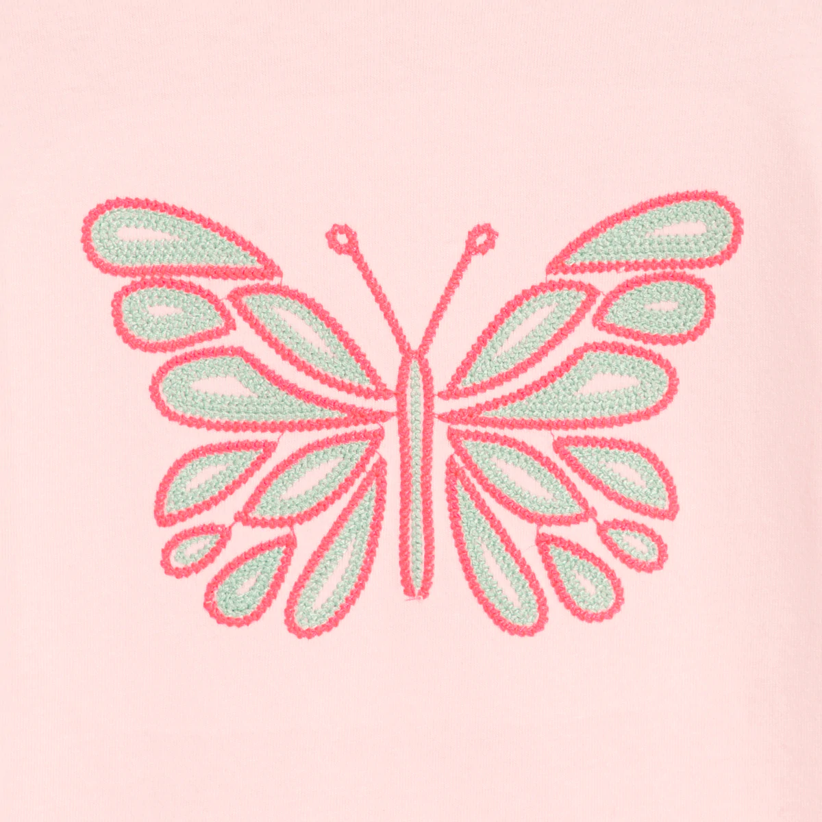 Бабочка полностью выполнена вышивкой. А в дополнение короткие рукава украшены воланами, похожими на крылья бабочки! Мягкий джерси розового цвета. Прямой крой. Круглая горловина. Рукава-бабочки, обшитые контрастным гладьевым швом. Слегка закругленный низ.