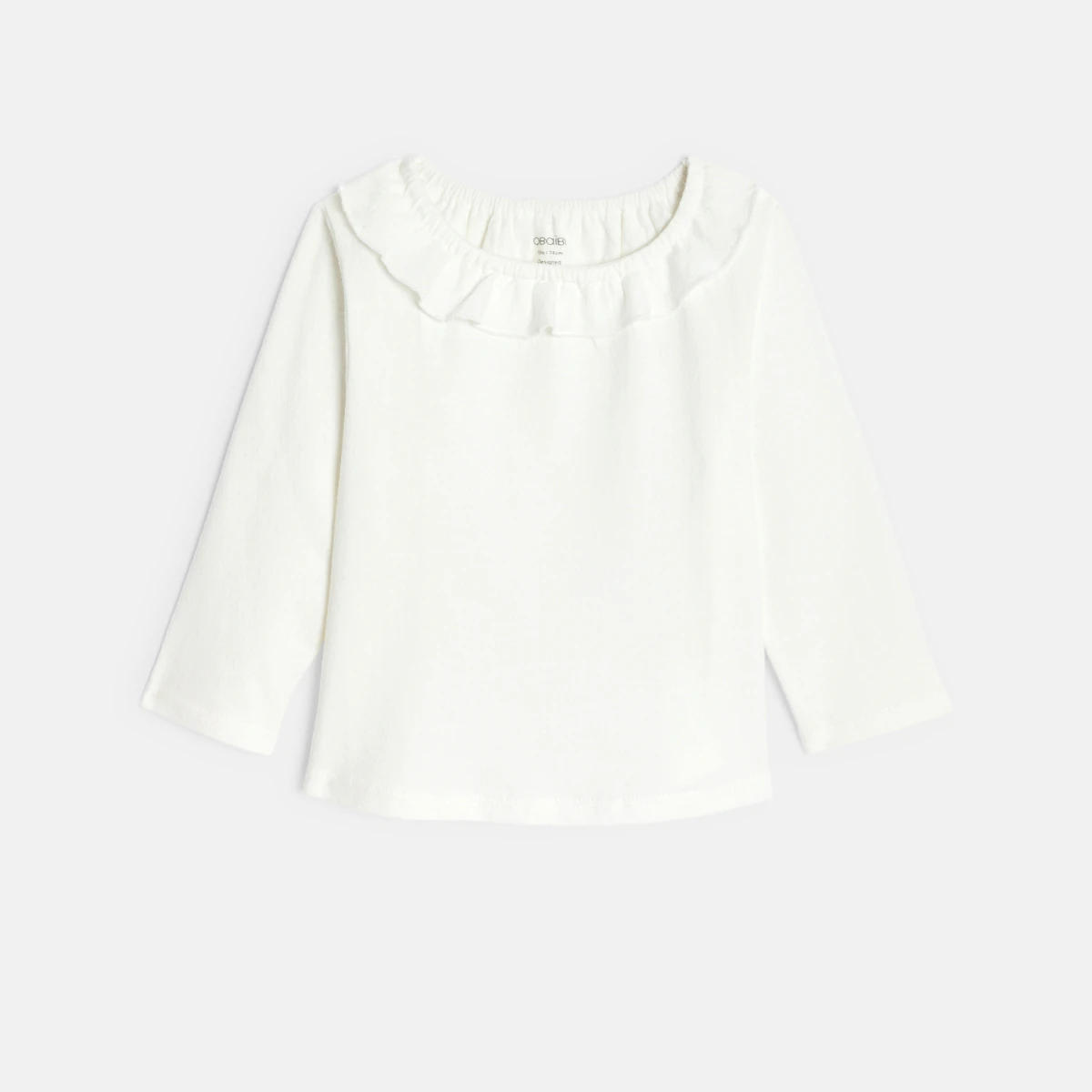 Футболка с длинными рукавами — обязательный элемент гардероба каждой маленькой девочки, ее можно носить как с юбкой, так и с брюками. Эта модель сделана из хлопка с рельефным эффектом и придаст оригинальность любому образу благодаря своему волнистому воротнику. Удобный крой, слегка расширяющийся книзу.