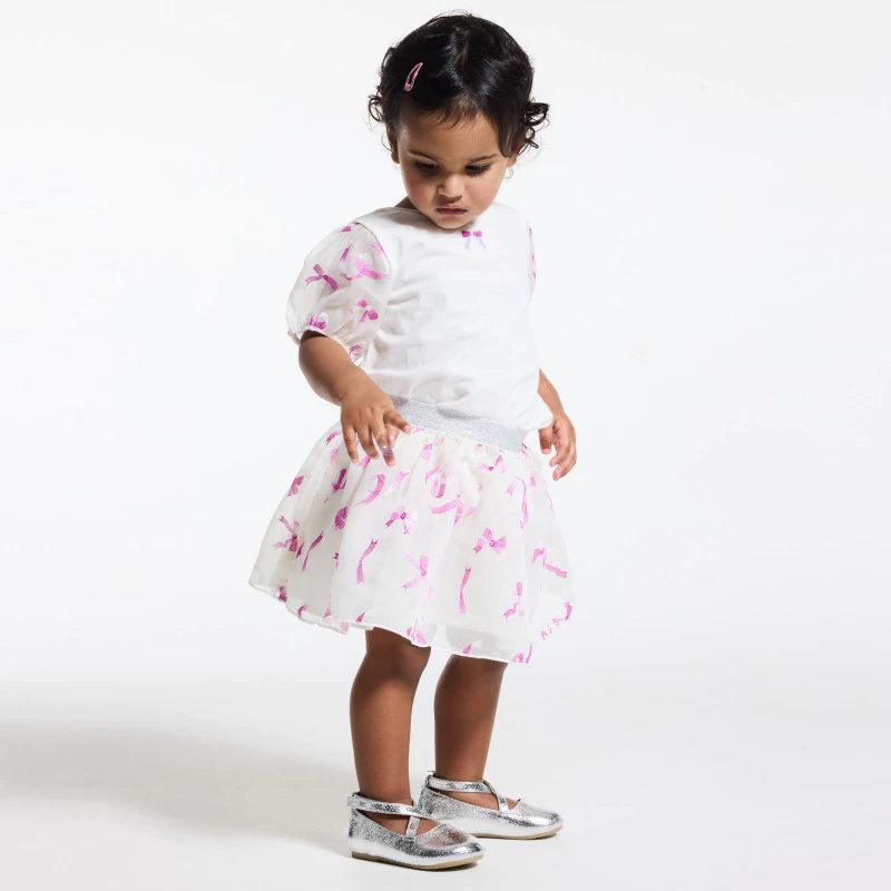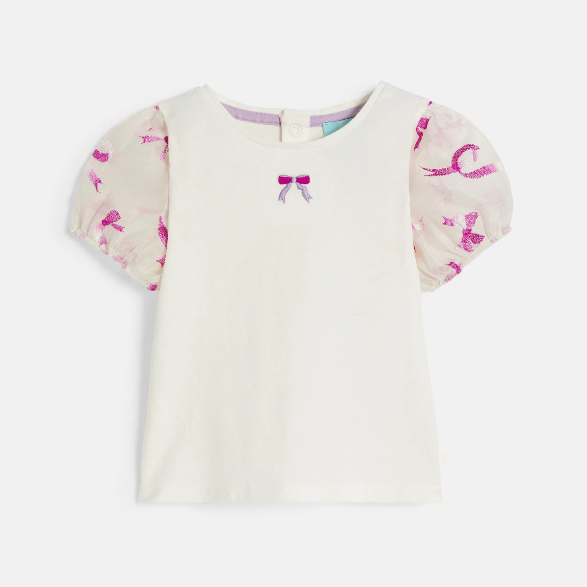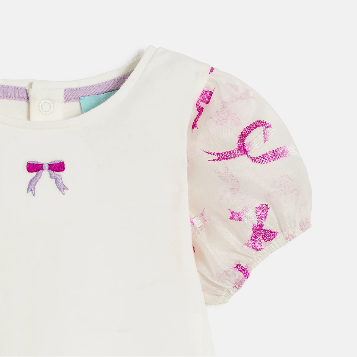 Эта футболка очень нравится девочкам благодаря своим маленьким вышитым бантикам и коротким рукава из хлопка с рисунком. Ее можно надеть с брюками или юбкой на праздник или торжественное мероприятие. Кнопки сзади, чтобы ребенка было легче одевать.