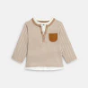 Вам понравится эта оригинальная футболка с воротом на пуговицах из полосатого трикотажа с красивыми накладными деталями. Длинные рукава, налокотники и накладной карман контрастного цвета.