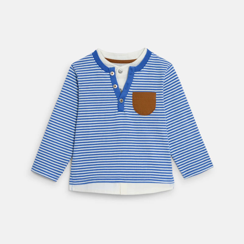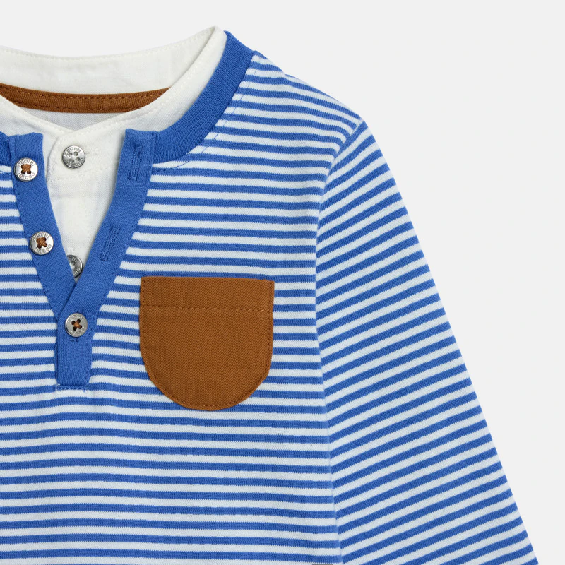 Футболка с воротом на пуговицах в полоску синего цвета для новорожденного