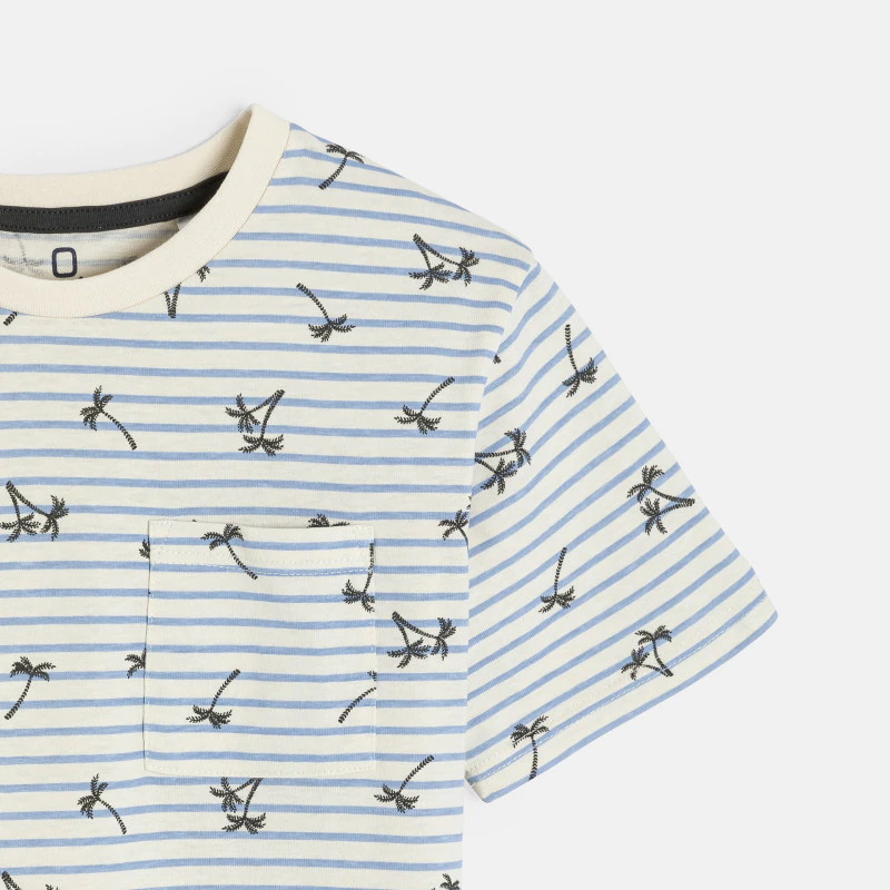 Эта футболка с короткими рукавами сочетает в себе разные стили: на ней встречаются полоски и пальмы! Мягкий трикотаж. Прямой крой. Круглая контрастная горловина в рубчик, легко надевается. 1 нагрудный карман. Прямой низ. Прошивка в тон.