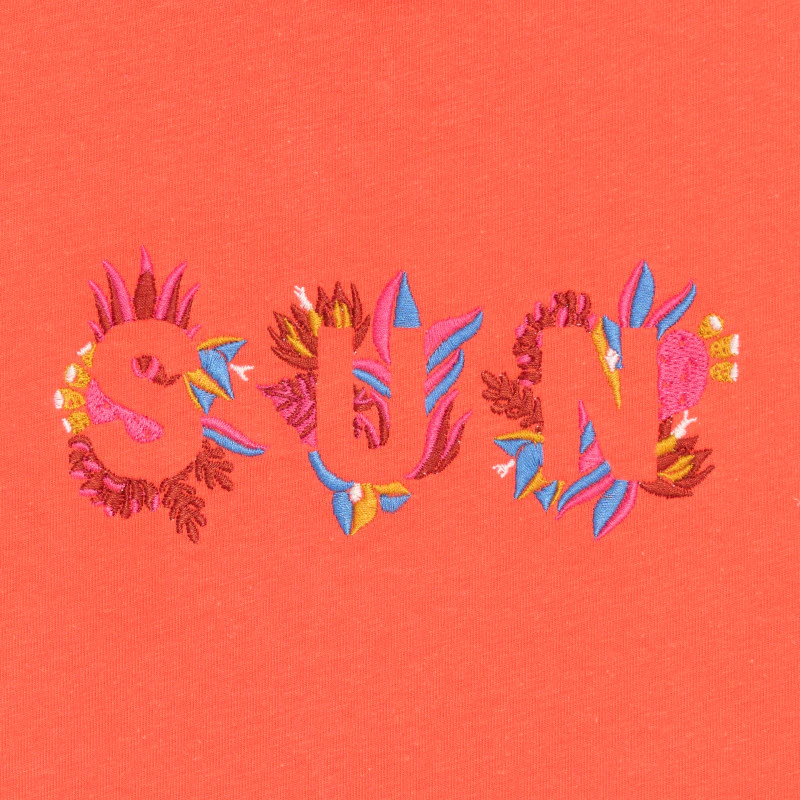 Обратите внимание на надпись SUN, вышитую спереди, — она великолепна и придает индивидуальность этой футболке, специально созданной для теплой погоды! Мягкий трикотаж. Прямой крой. Круглая горловина. Короткие рукава. Однотонная задняя часть. Прямой низ. Прошивка в тон.