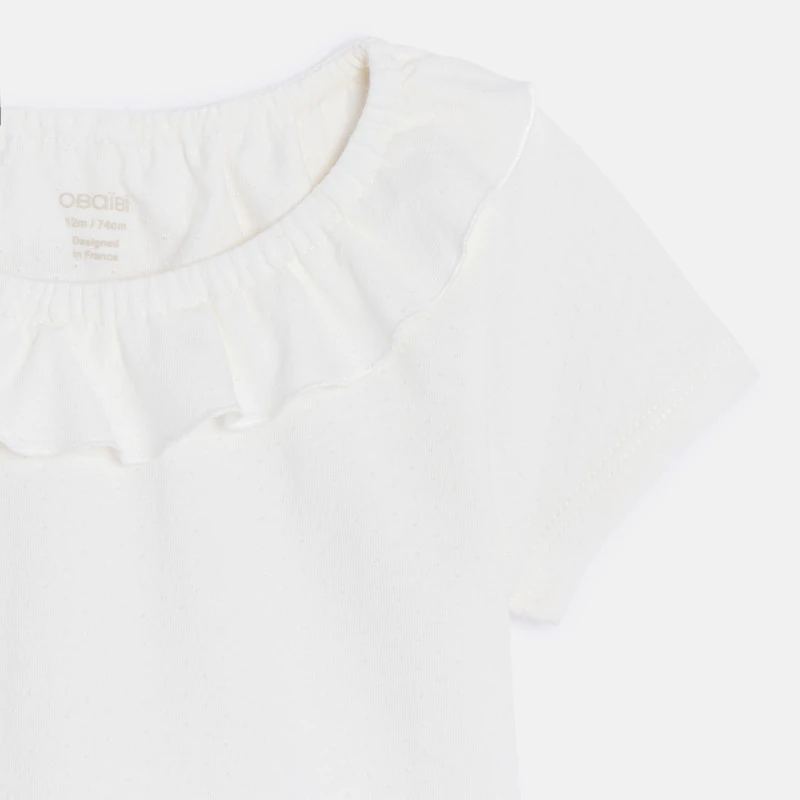 Эта элегантная и удобная футболка с широким волнистым вырезом на резинке создаст романтичный образ для маленькой девочки. Короткие рукава и слегка расширяющийся книзу крой.