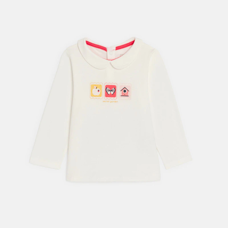 Эта футболка просто необходима в девичьем гардеробе. Она сделана из суперприятного на ощупь трикотажа, имеет длинные рукава и небольшой воротничок. Кнопки сзади, чтобы легче было просовывать голову.