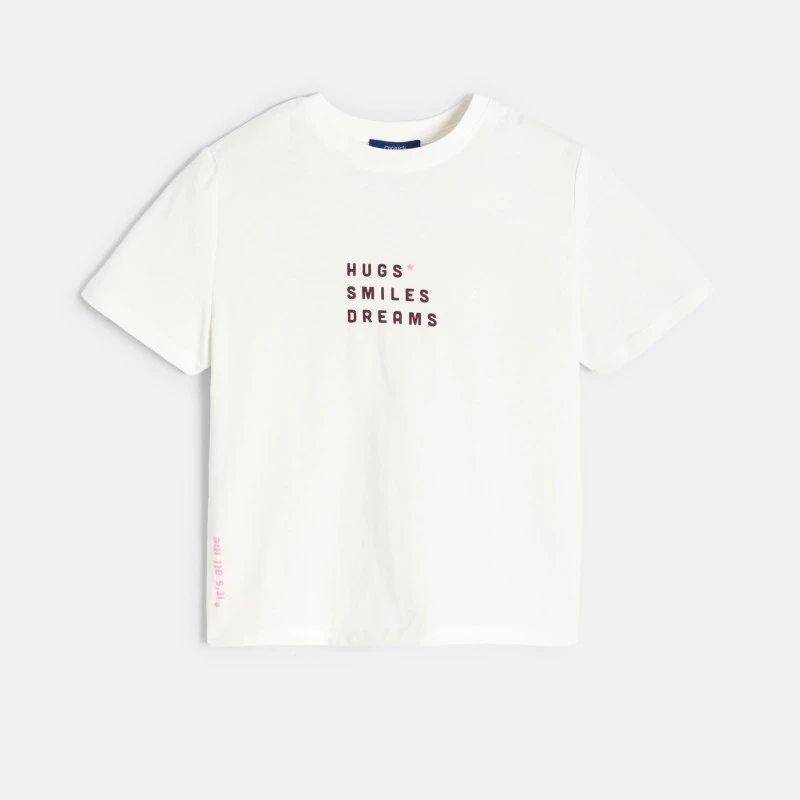 описание С помощью этой футболки с короткими рукавами ваша девочка сможет передать нежное послание как можно большему количеству людей! Мягкий трикотаж. Круглая горловина. Надпись спереди, однотонная задняя часть. Короткие рукава. Прямой низ. Прошивка в тон.