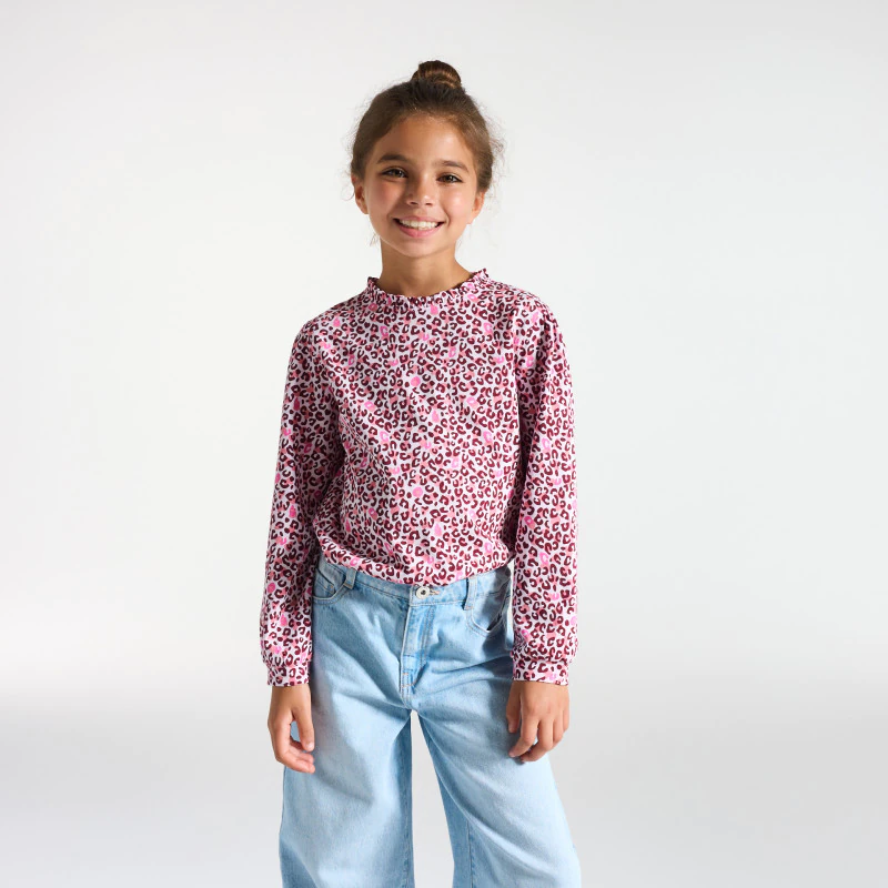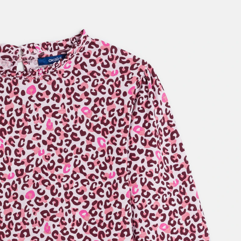 Быстро приручается и уже популярен: леопард захватывает девичий гардероб! Вам понравится круглая горловина с волнистой отделкой и вырез в виде капли на пуговице сзади. Мягкий трикотаж. Прямой крой. Длинные слегка объемные рукава со складками сверху, подчеркнутые манжеты. Слегка закругленный низ.