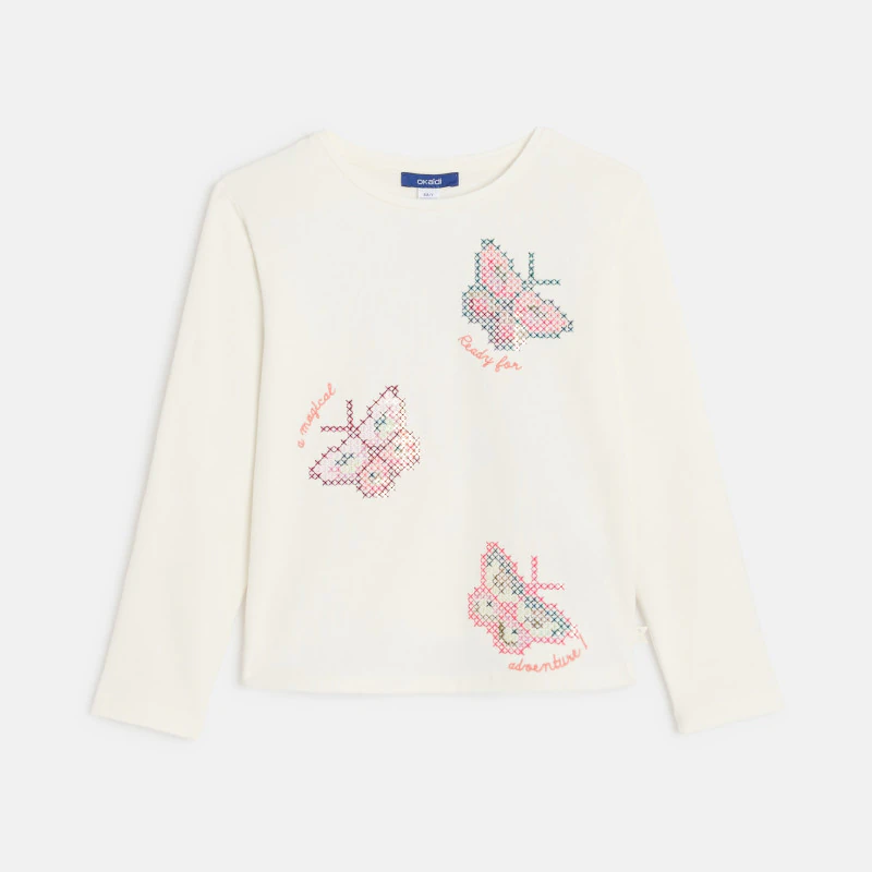 Футболка с длинными рукавами и узором «Бабочка» цвета экрю для девочки