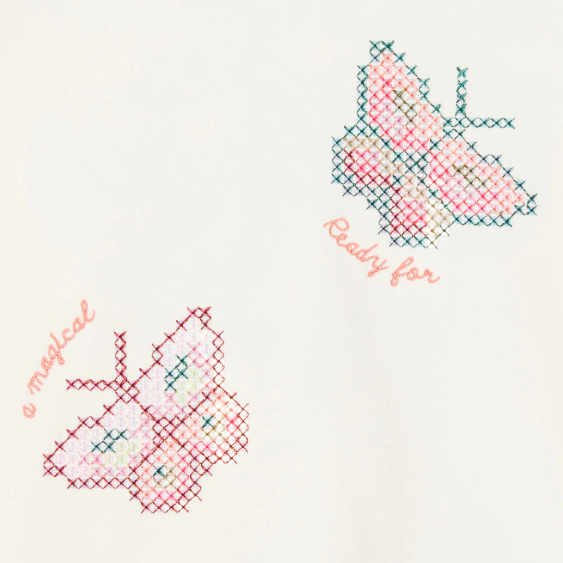 Мода — это всегда возвращение к хорошо забытому старому! Хорошая новость: вышитые крестиком бабочки добавляют красок этой футболке из мягкого трикотажа. Прямой крой. Круглая горловина. Вышитая надпись. Длинные рукава. Однотонная задняя часть. Прямой низ. Прошивка в тон.