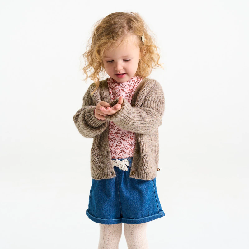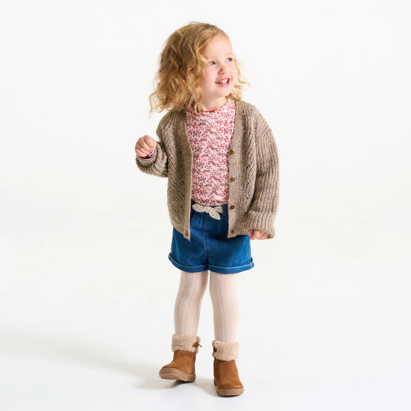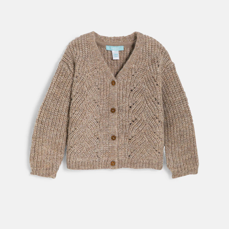 Теплый кардиган из вязаного трикотажа бежевого цвета для девочки ясельного возраста