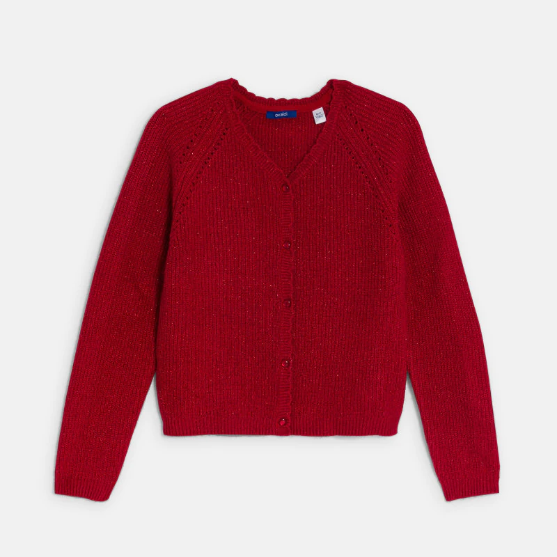 Жизнь всегда прекрасна, особенно если бонусом идут пайетки! Тому доказательство — этот кардиган из мягкого трикотажа в рубчик. Прямой крой. V-образный ворот с фестонным краем. Застежка на пуговицы в тон. Пройма реглан с ажурной отделкой. Длинные рукава. Прямой низ. Отделка резинкой по краям.