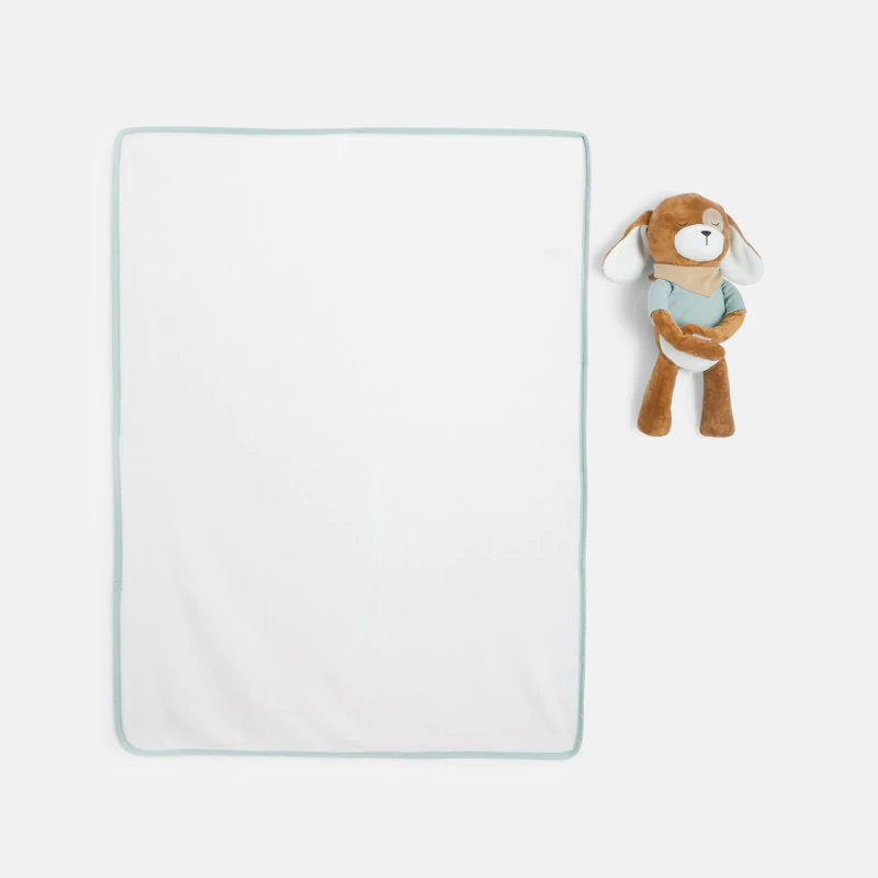 Мягкий кролик из бархата позабавит малыша и ласково успокоит его. А плед в тон окружит ребенка комфортом и нежностью. Игрушка из мягкого бархата (высота примерно 23 см) держит между лап на липучке флисовое покрывало (примерно 100 x 70 см). Восхитительный подарок на рождение ребенка.