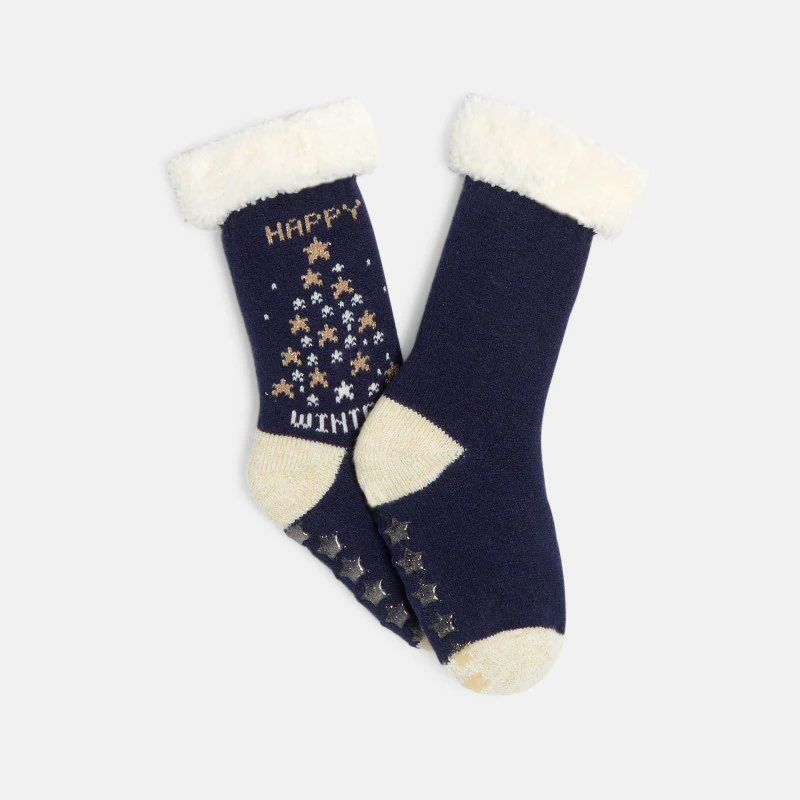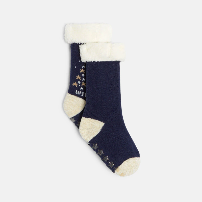 Эти мягкие нескользящие высокие носки сохранят ножки вашей девочки в тепле! Носки-тапочки из мягкого тянущегося трикотажа с подкладкой из искусственного меха под барашка. Рождественский узор. Обозначенные носок и пятка. Хорошая идея для подарка.