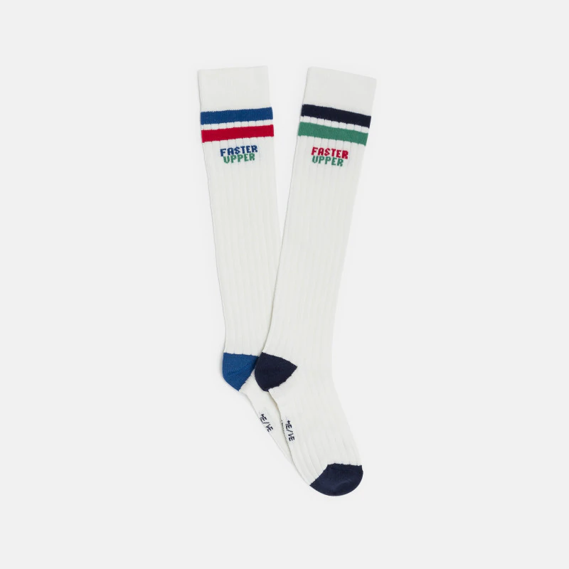 Модные белые носки с цветной резинкой и логотипом «FASTER UPPER». Изготовлены из мягкого, тянущегося хлопка для оптимального комфорта. Усиленные пятки и носки обеспечивают дополнительную прочность. Идеально подходят для повседневного использования или спорта. Легко надеваются, отлично сидят. Идеально подходят для того, чтобы добавить ретро-нотки к любому наряду.