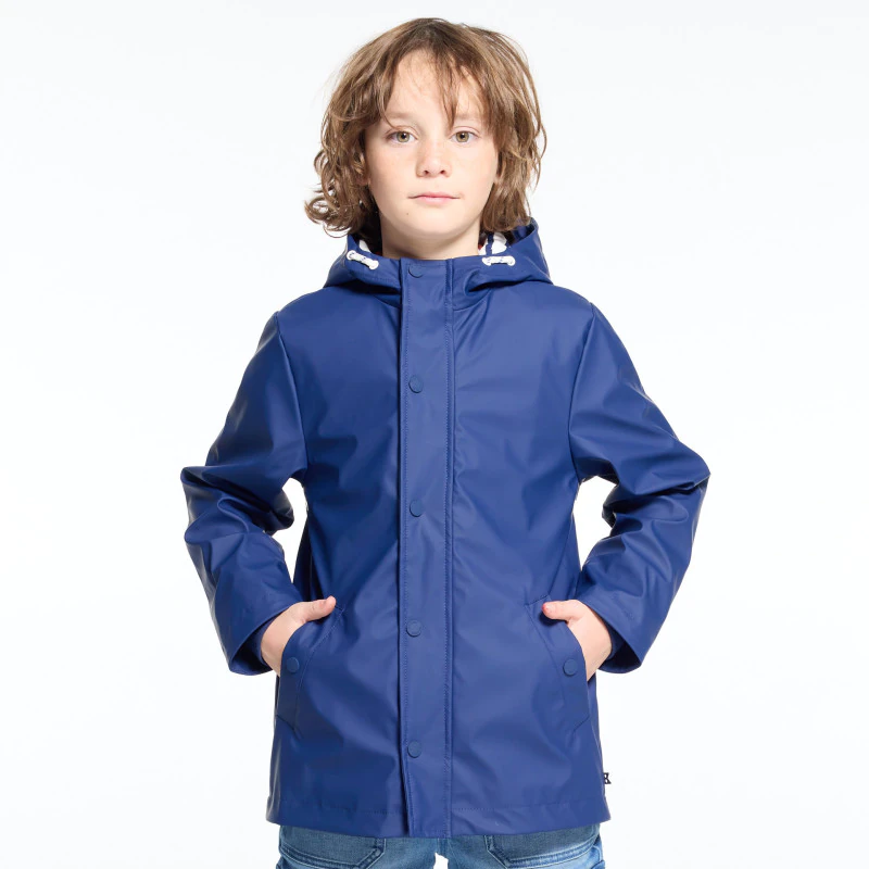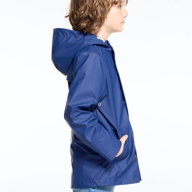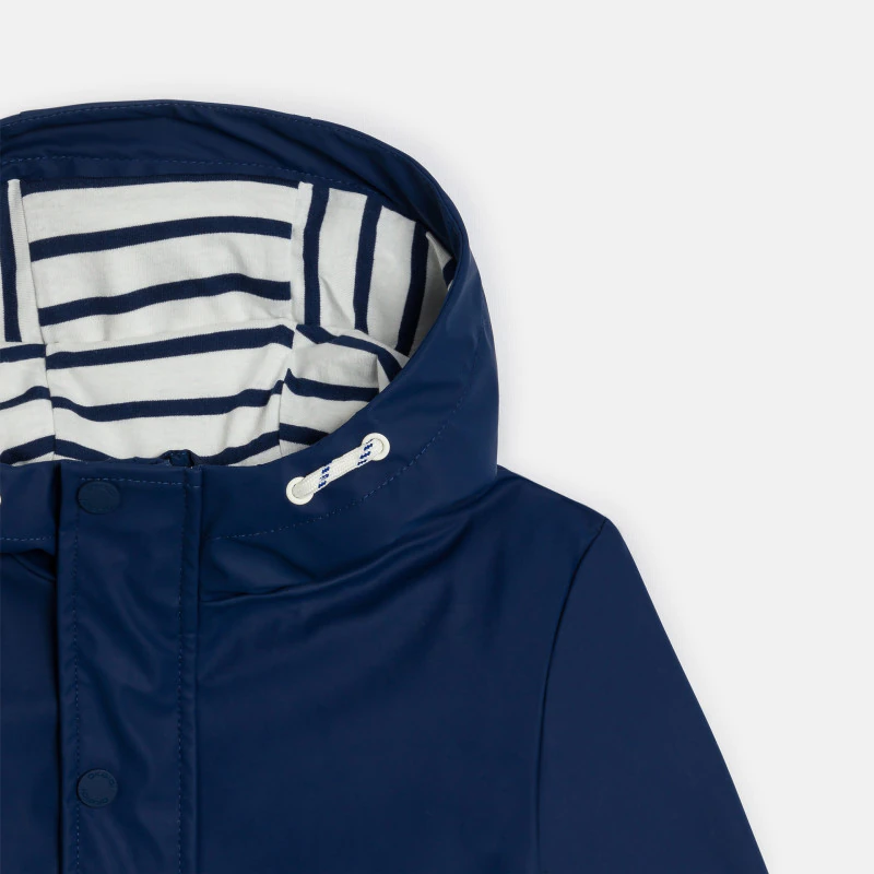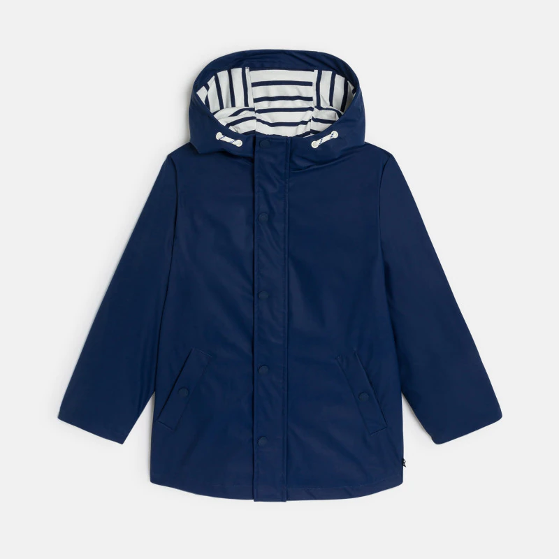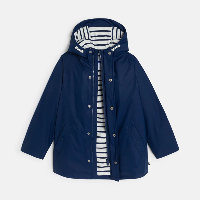 описание Скорей бы дождь, ветер и прогулки на свежем воздухе! В этом дождевике с капюшоном так приятно наслаждаться переменчивой погодой. Эластичная водоотталкивающая ткань. На подкладке из трикотажа в матросскую полоску. Прямой крой. Капюшон с подкладкой из джерси. Застежка-молния под защитной планкой на кнопках. Длинные рукава, манжеты в рубчик. 2 кармана на кнопках. Вешалка и именная этикетка внутри.
