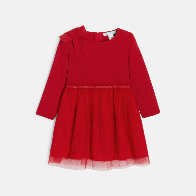 В этом платье ваша девочка будет выглядеть элегантно на празднике! Верх с длинными рукавами, украшенный оригинальным бантом на плече, и низ из плиссированного тюля на подкладке. Застежка сзади позволяет легко одеть ребенка.