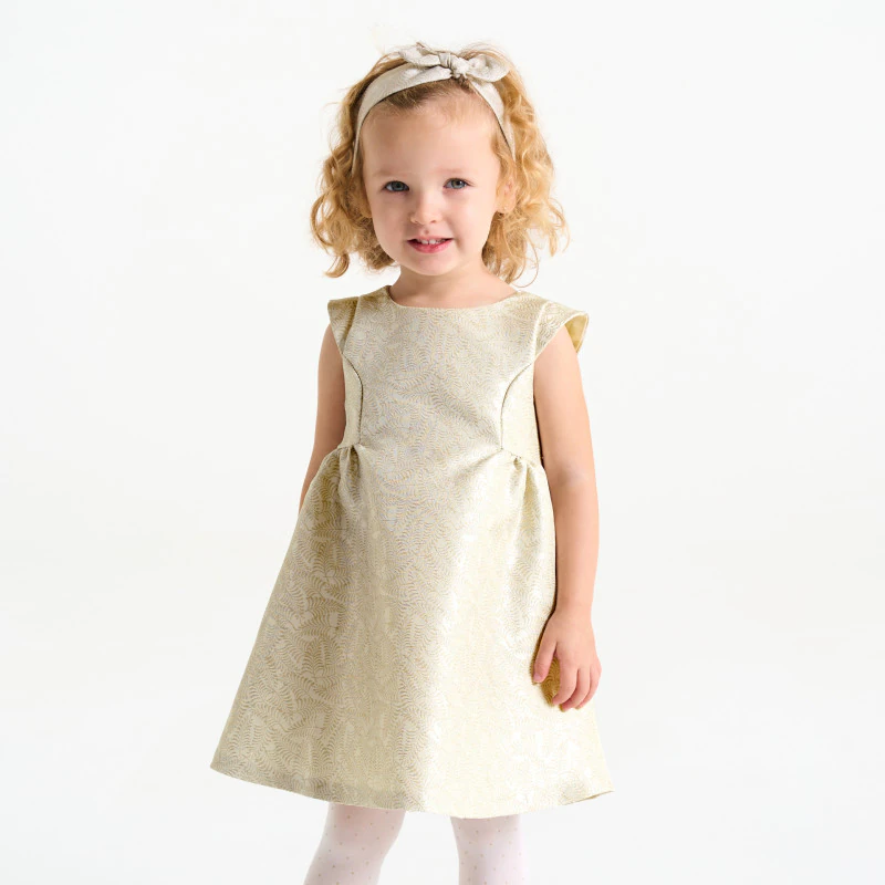 Это платье — незаменимый наряд для королевы праздника. Переливающийся жаккард с цветочными узорами непременно заставит глаза вашей девочки блестеть от радости. Короткие рукава и складки на талии. Застежка на молнию сзади. Блумеры включены для размеров от 3 до 23 месяцев.