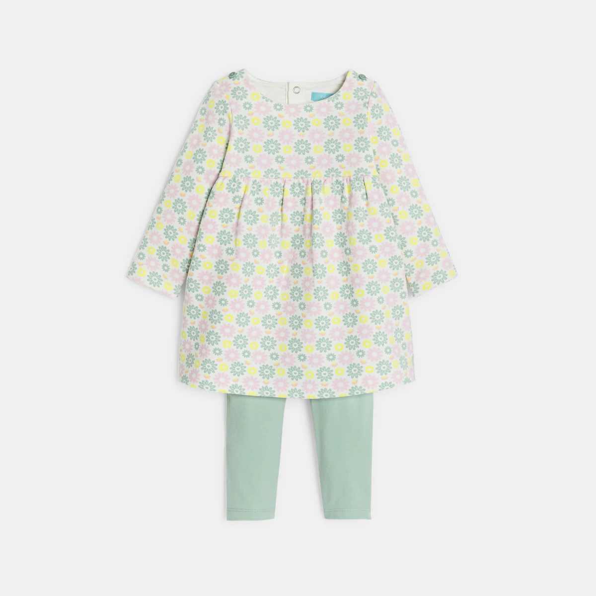 Платье с рельефным эффектом в цветочек и легинсы зеленого цвета для новорожденной