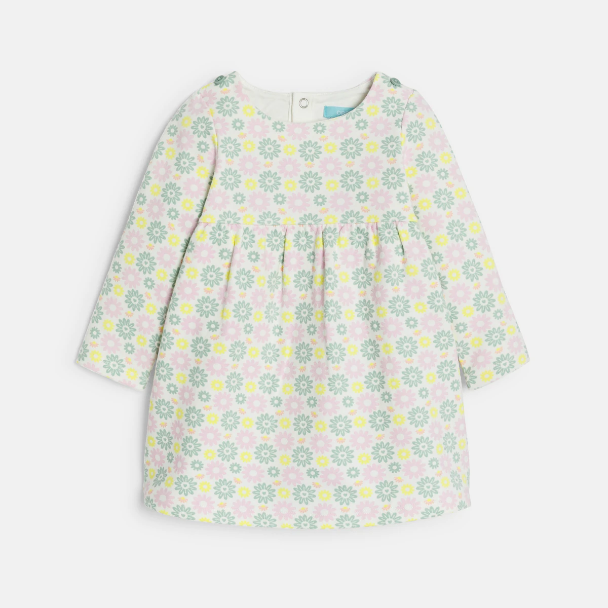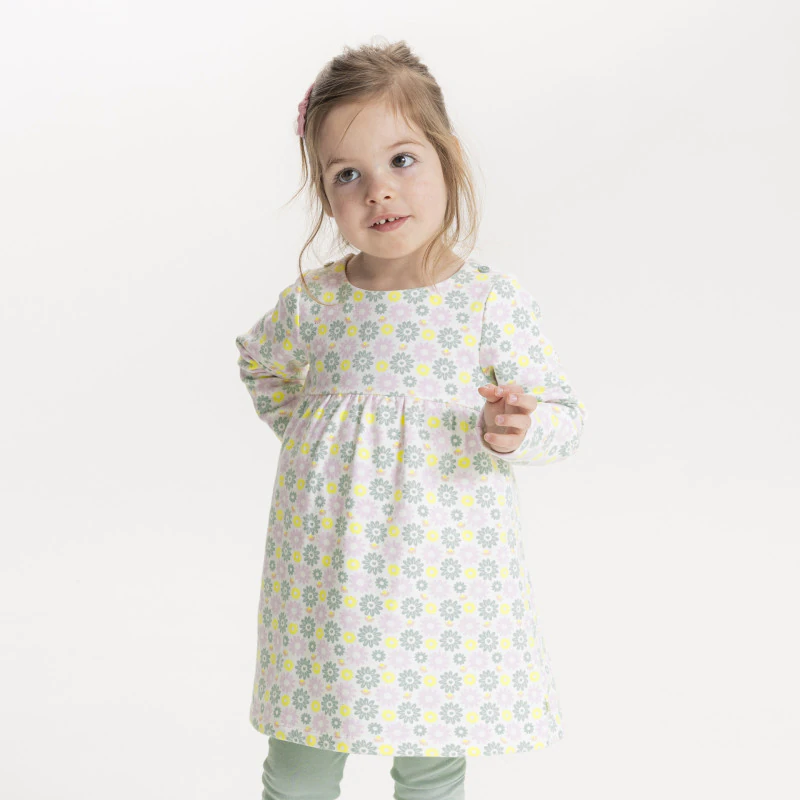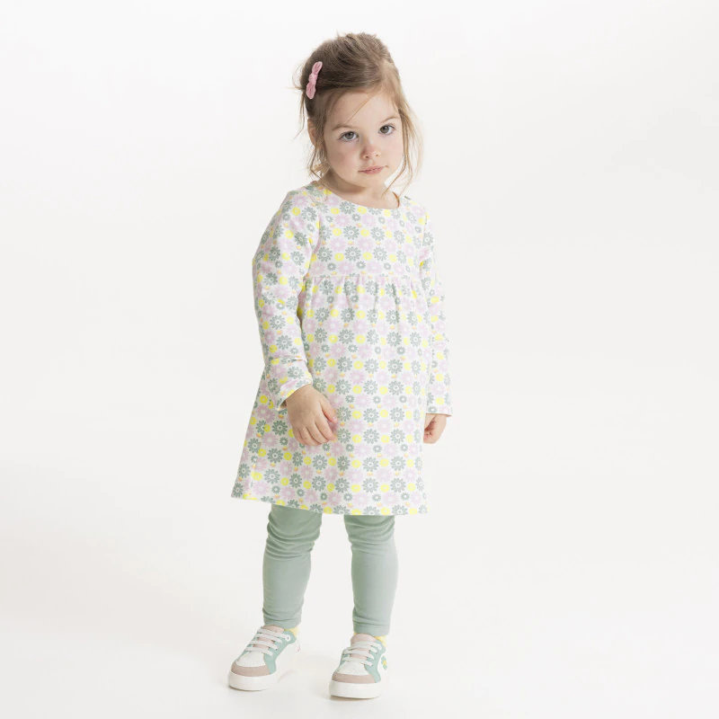 Эта платье с принтом в виде цветов привнесет яркие нотки в девичий гардероб. Слегка расширяющаяся книзу модель с длинными рукавами из теплого хлопка с рельефным эффектом. Застегивается на две кнопки на плече. Зеленые легинсы создают ансамбль.