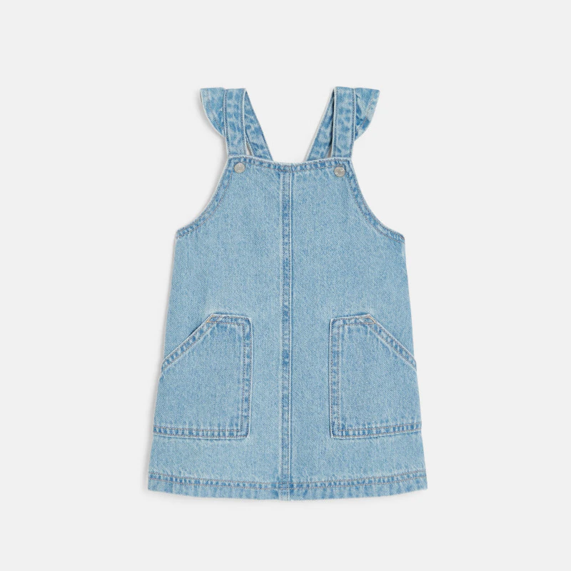 Это платье-комбинезон с волнистыми бретелями всегда выглядит актуально! У него прямой фасон с накладными карманами, который так нравится девочкам. Из денима, с регулируемыми с помощью кнопок бретелями.