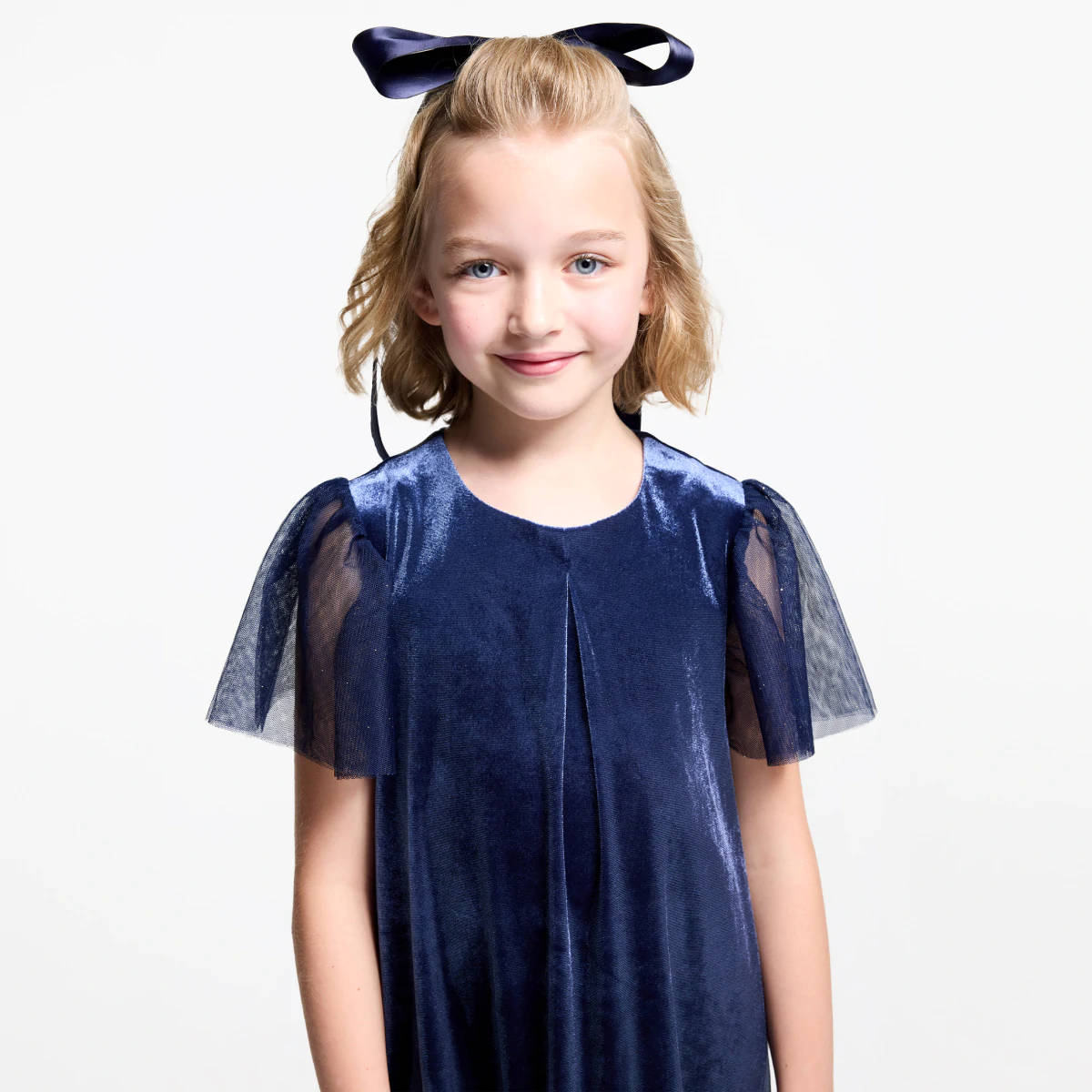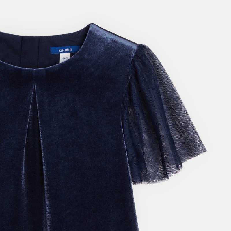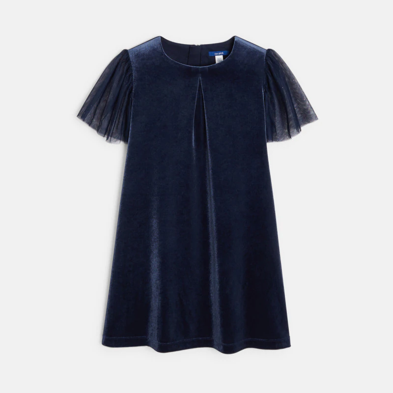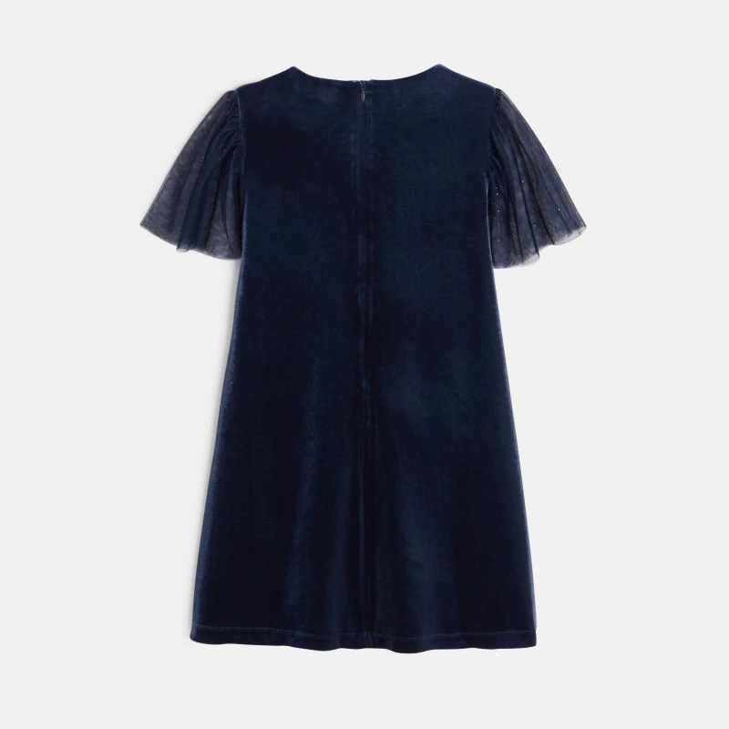 Элегантная и нарядная модель! Мягкий сатиновый бархат и легкие рукава из тюля заставляют мгновенно полюбить это расширяющееся книзу платье! Закругленный вырез горловины. Короткие рукава-бабочки. Складка внутрь спереди. Застежка на молнию-невидимку сзади. Длина выше колена.