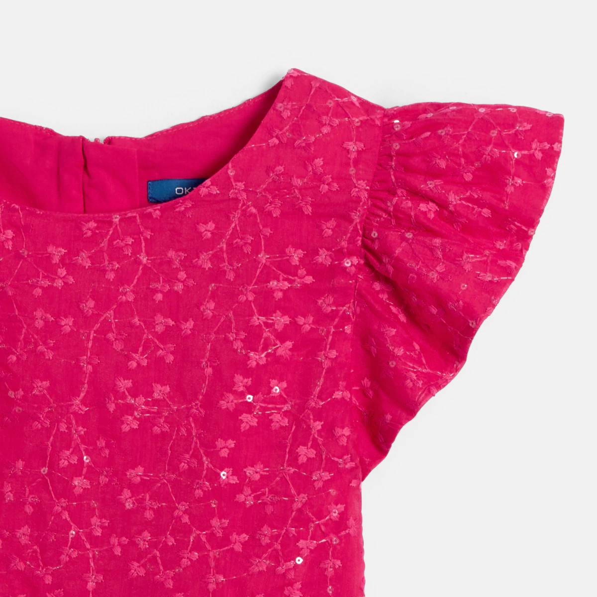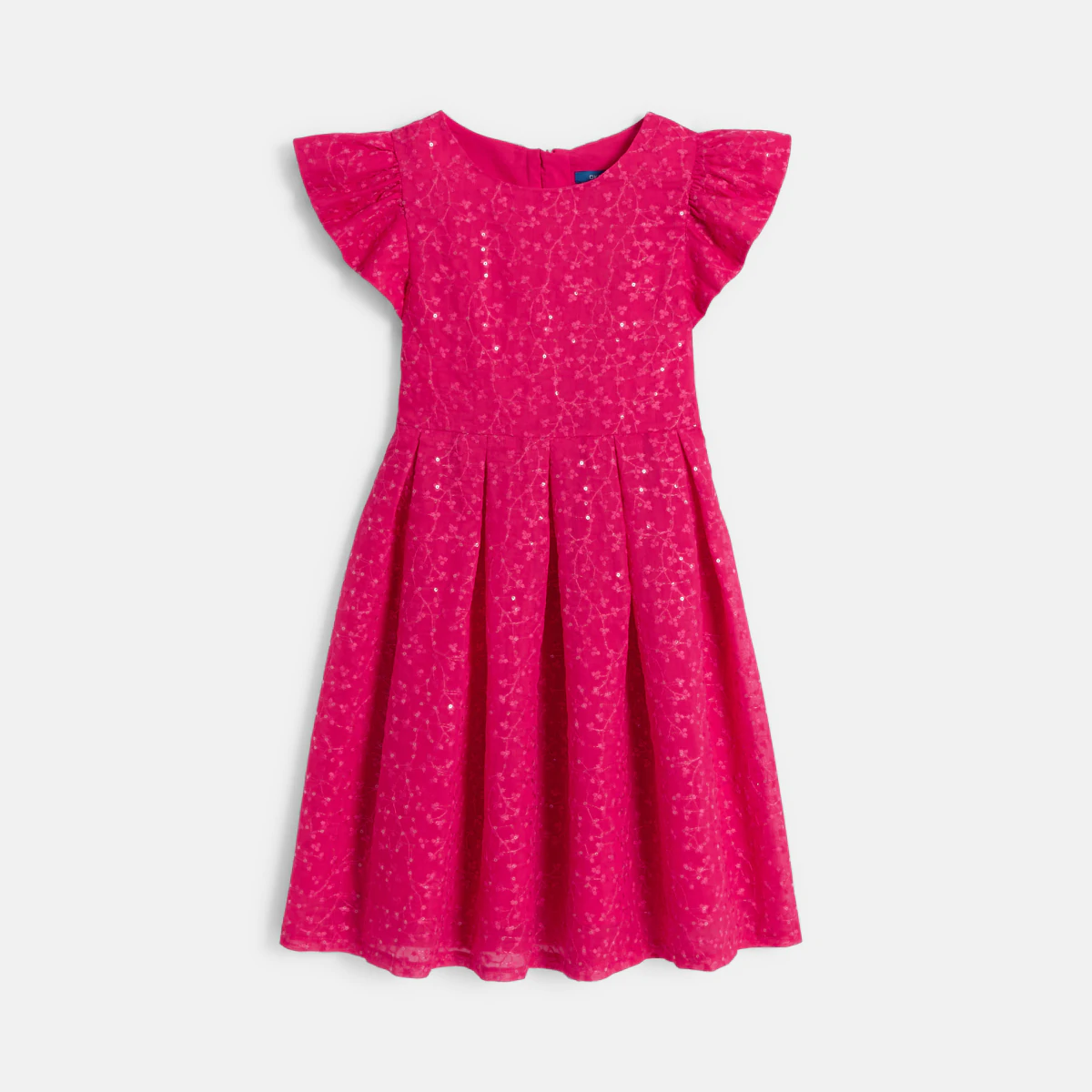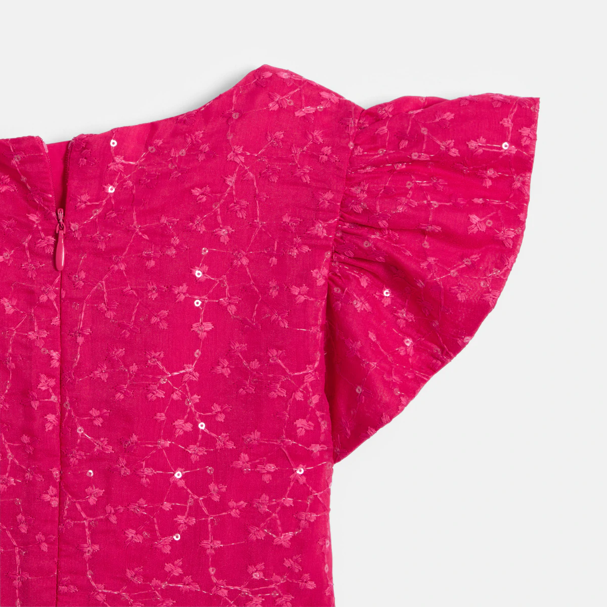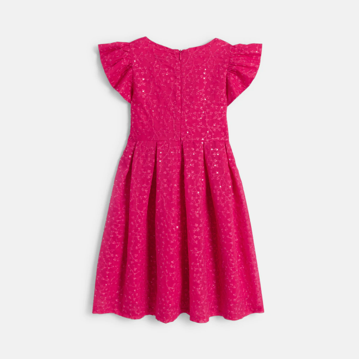 Яркий цвет фуксии. Вышитые цветы, украшенные блестками. Рукава с воланами. Расширяющийся книзу крой. Это платье производит впечатление на девочек. Закругленный вырез горловины, застежка-молния на спине, легко надевается. Акцентированная талия. Подкладка.