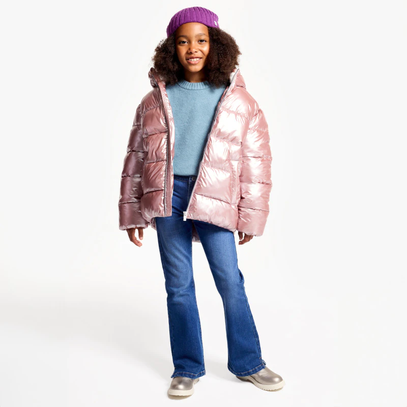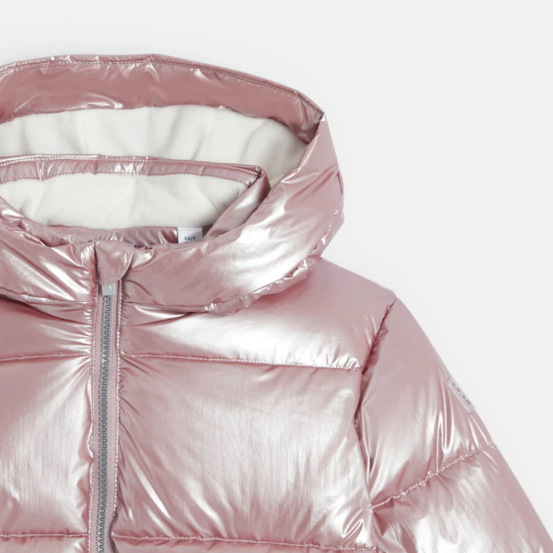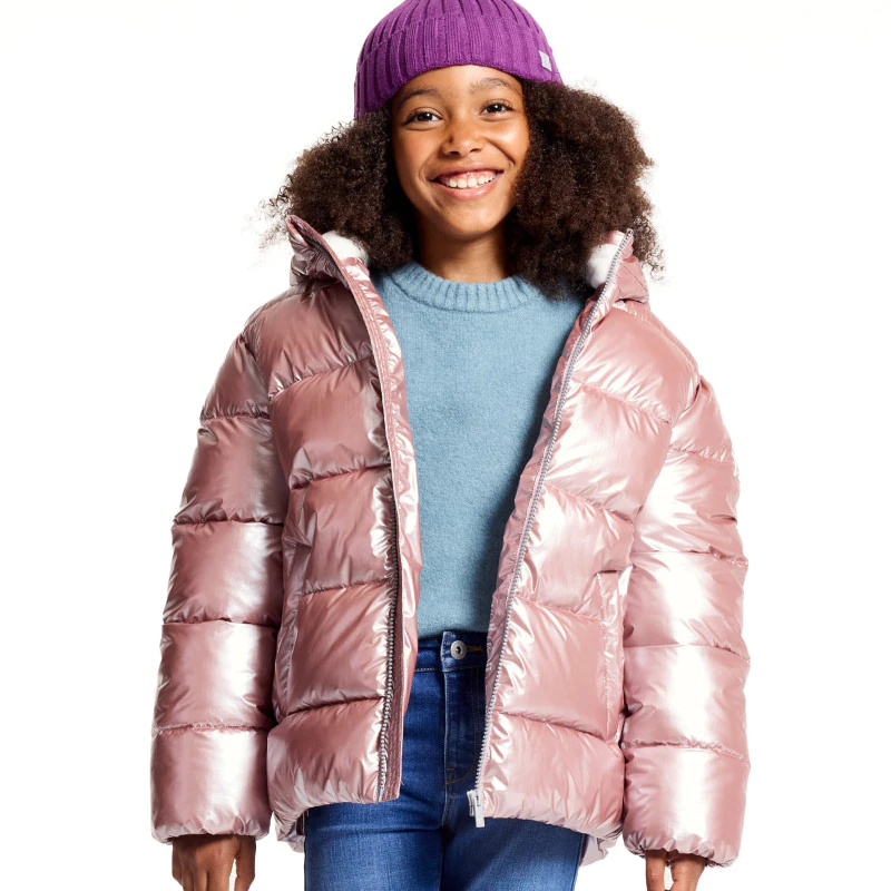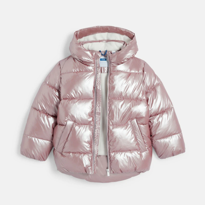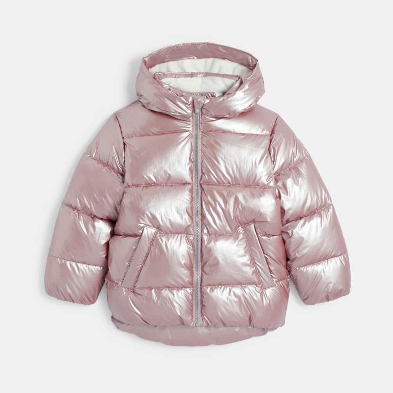 Теплый пуховик с металлическим эффектом розового цвета для девочки