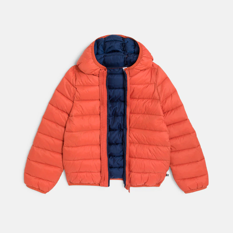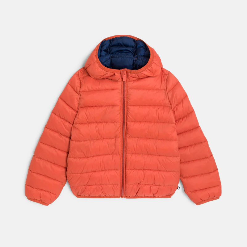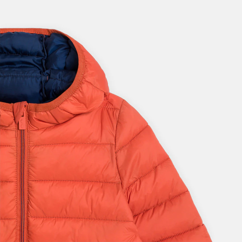 Пуховик с капюшоном оранжевого цвета для мальчика