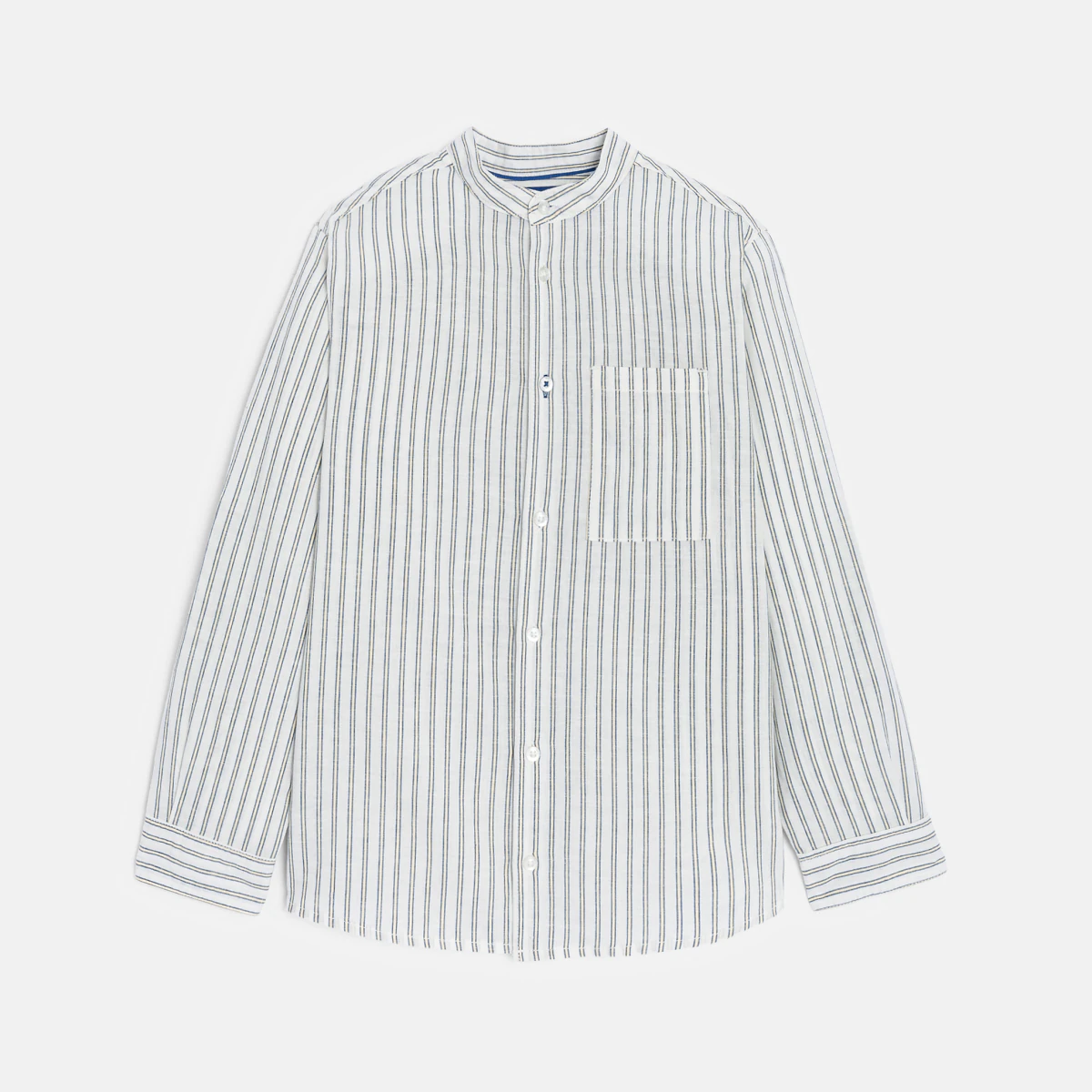 Эта рубашка в полоску — классический элемент в гардеробе мальчика. Приятная в ношении ткань из смеси хлопка и льна. Прямой крой. Воротник мао. На пуговицах. 1 нагрудный карман. Длинные рукава, которые можно закатать с помощью хлястика на пуговице. Манжеты на пуговицах. Закругленный низ. Прострочка.