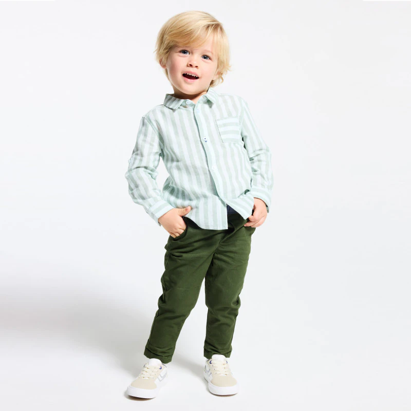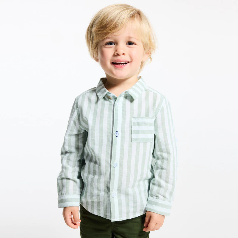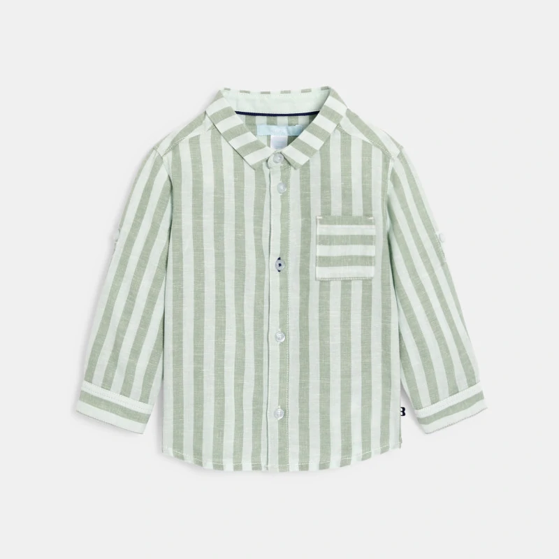 Рубашка из льна и хлопка с закатываемыми рукавами зеленого цвета в полоску для новорожденного