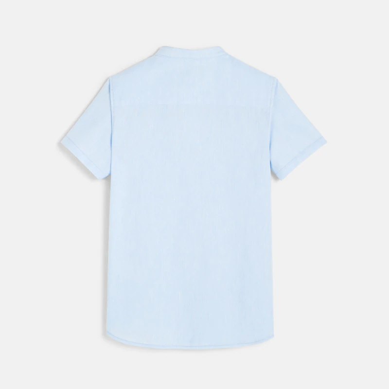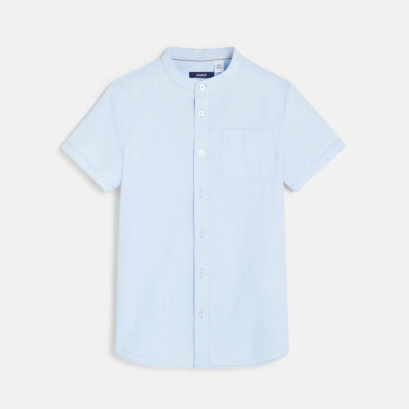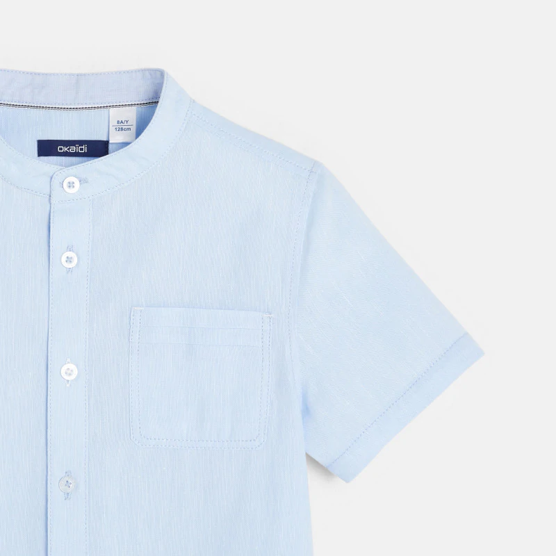 Рубашка для мальчика. Поплин из хлопка и льна, с видимой структурой. Прямой крой. Воротник мао. Подкладка на плечах. Застежка на пуговицы во всю длину спереди. 1 карман на груди. Короткие рукава. Закругленный низ. Декоративная прошивка в тон. Декоративный ярлычок Okaïdi.