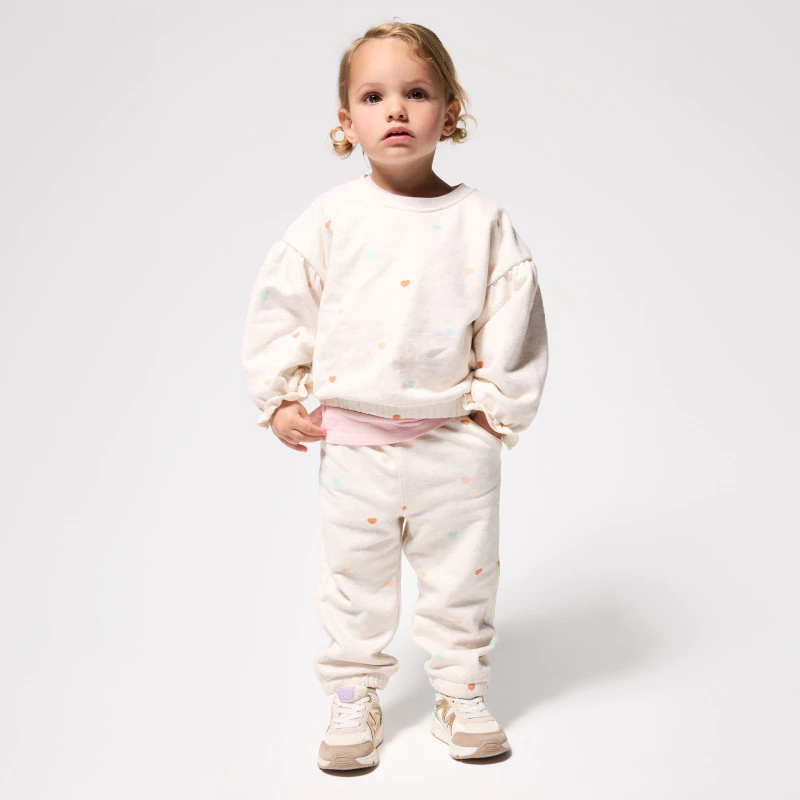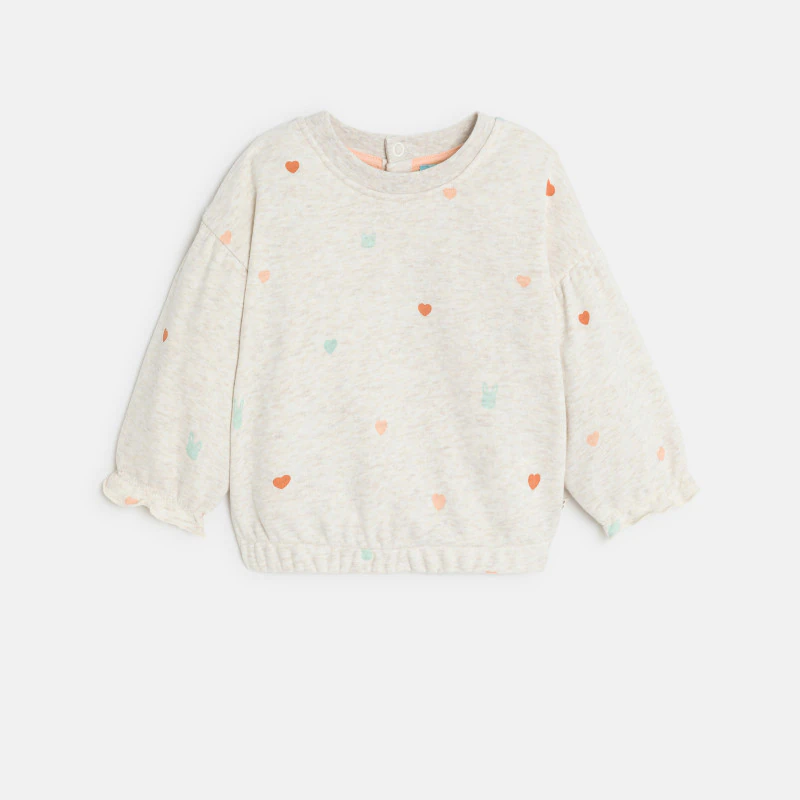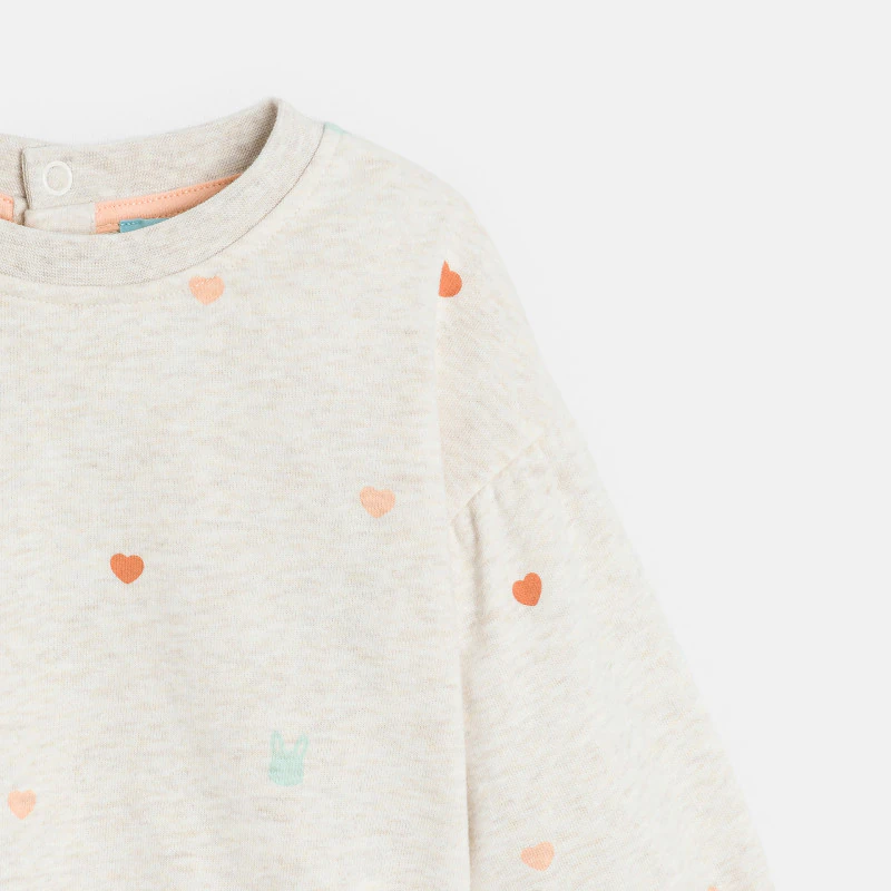 Маленькие сердечки и мордочки — вам понравится этот узор в тон! Девочки обожают эту толстовку с приятными деталями: длинные рукава реглан с эластичными манжетами, эластичный низ и округлый вырез горловины с кнопками сзади.