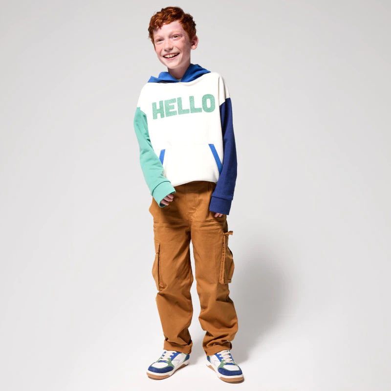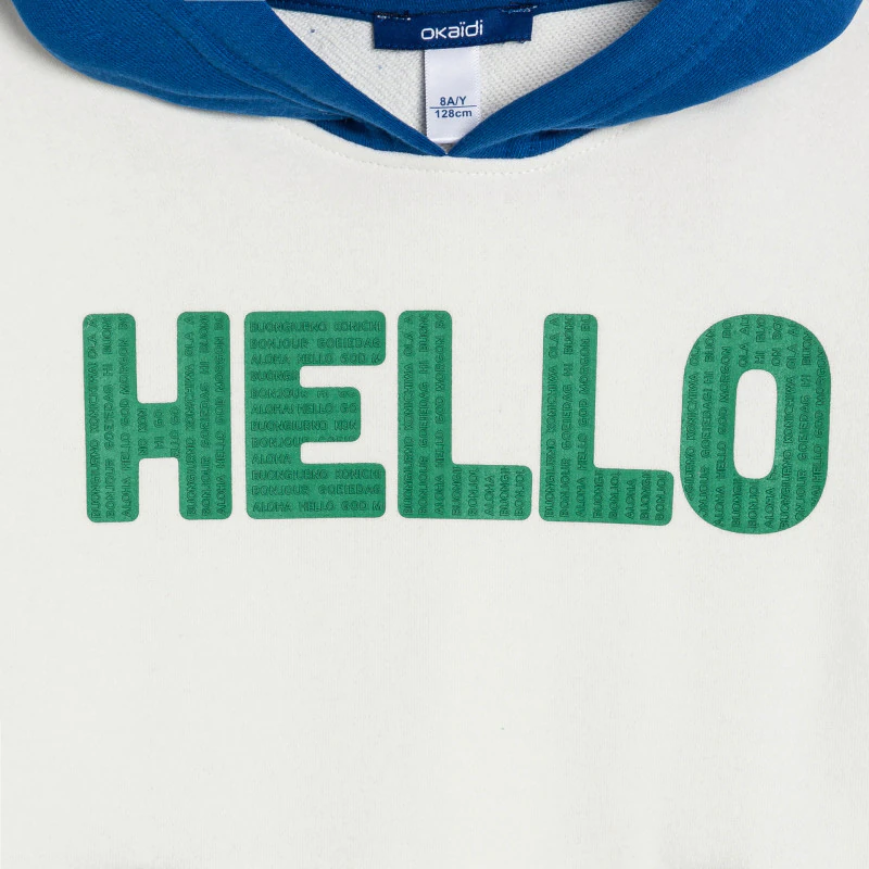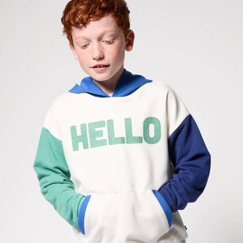 Эта яркая толстовка сочетает в себе стиль и комфорт благодаря своему свободному крою. Она изготовлена из мягкого мольтона, украшена контрастной надписью «HELLO» и выделяется своими зелено-черными рукавами в стиле колор-блок. Она подходит для повседневного использования, имеет защитный капюшон и карман-кенгуру, чтобы руки оставались в тепле. Легко надевается, идеальный вариант для любых приключений.